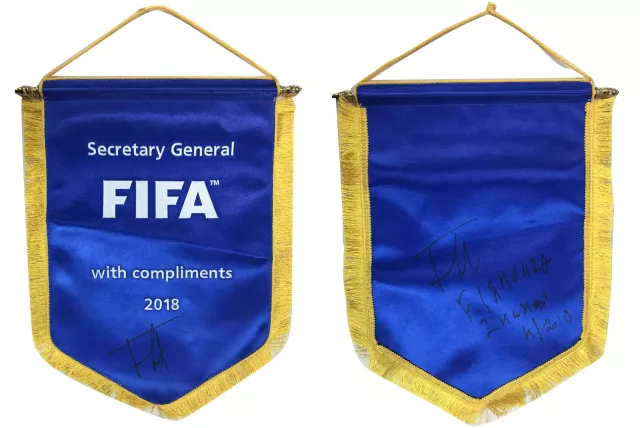 (圖:國際足聯(lián)秘書長(zhǎng)法特瑪·薩姆拉贈(zèng)送親筆簽名的國際足聯(lián)會(huì)旗)