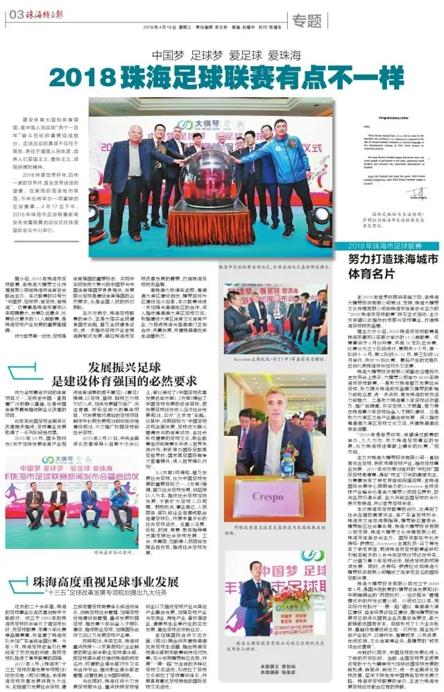 2018年是世界杯年,四年一度的世界杯,是全世界球迷的盛宴。在美麗的海濱城市珠海,今年也將舉辦一項(xiàng)重磅的足球賽事。4月17日下午,由珠海大橫琴投資有限公司策劃、支持,珠海大橫琴文化傳媒有限公司和珠海市體育總會(huì)主辦的“2018珠海市足球聯(lián)賽”昨天正式啟動(dòng),希望以此推動(dòng)珠海市足球事業(yè)發(fā)展,打造珠海足球城市品牌。soccerex主席托尼·馬丁,阿根廷前國家隊(duì)隊(duì)員、傳奇球星克雷斯波,廣東省足球協(xié)會(huì)副主席、廣東足球運(yùn)動(dòng)中心主任程志文,廣東省政協(xié)委員、澳門中華總商會(huì)青年委員會(huì)主任馬志達(dá),珠海市文化體育旅游局副局長(zhǎng)鄔向明等出席了發(fā)布會(huì)并共同見證了聯(lián)賽啟動(dòng)。