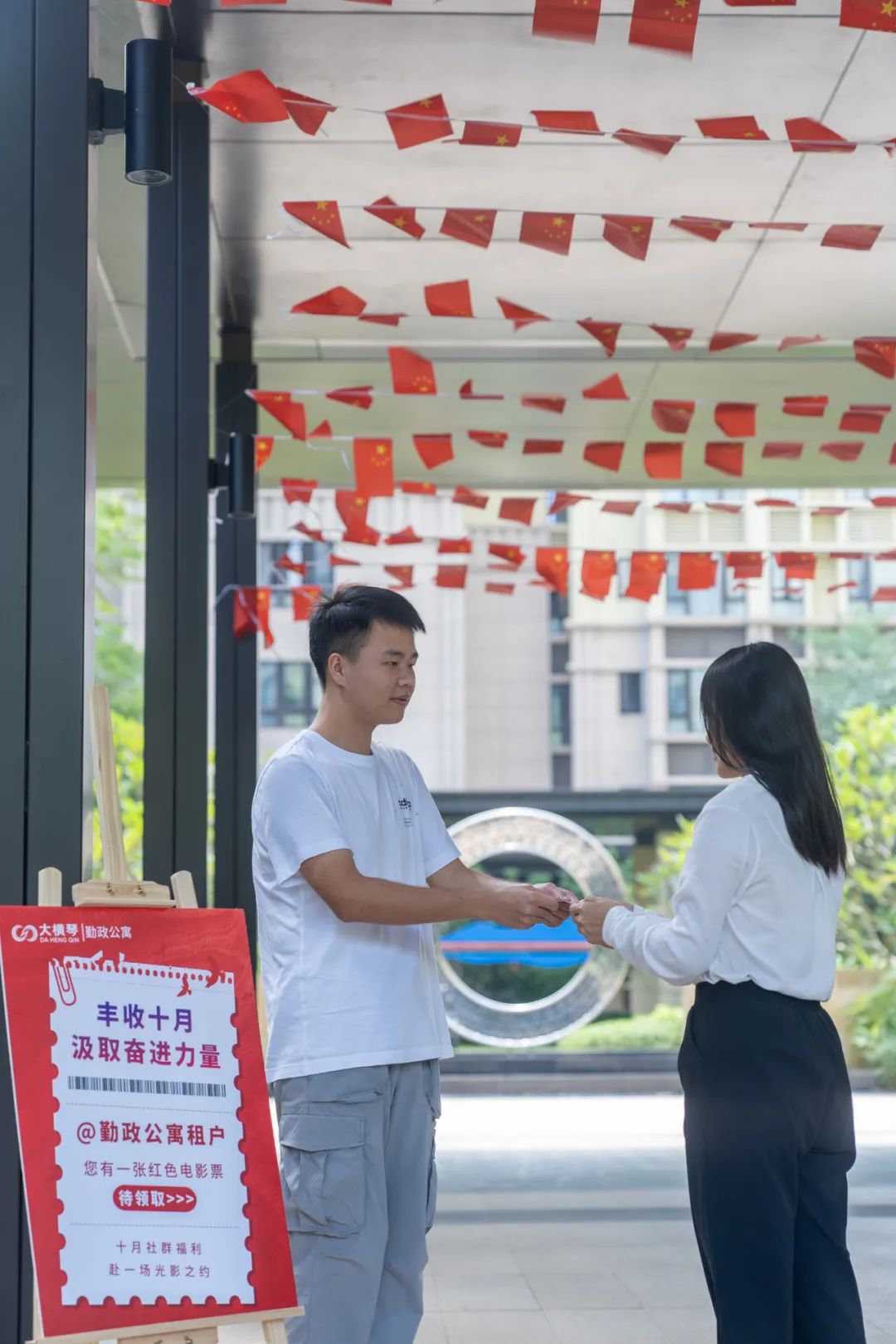 此外,大橫琴泛旅游公司也在旗下運(yùn)營的多個(gè)公寓項(xiàng)目推出國慶特色主題活動(dòng),陪伴假期留駐的住戶們度過一個(gè)喜慶、歡樂的國慶佳節(jié)。國慶黃金周期間,勤政公寓開展了“豐收十月 汲取奮進(jìn)力量”活動(dòng),通過播放免費(fèi)電影豐富住戶生活,傳播奮進(jìn)力量;斗門大橫琴5.0產(chǎn)業(yè)新空間倒班宿舍也開展了 “青年共話中國紅”國慶主題抽獎(jiǎng)活動(dòng),設(shè)置留言祝福墻,以青春之言,表白祖國。