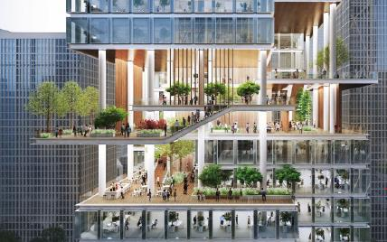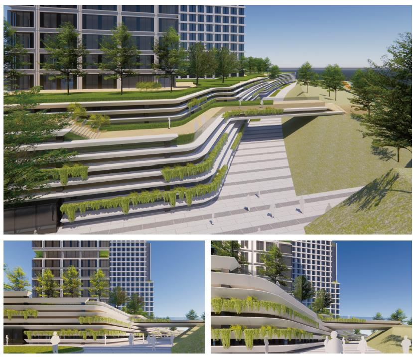 建筑組團中央,通高兩層的“城市客廳”成為思想碰撞的熔爐;三層空中云臺通過有蓋廊道串聯(lián)樓宇,形成全天候的公共步行紐帶;而垂直分布的空中花園與地面綠脊,共同構(gòu)建出覆蓋率超30%的生態(tài)綠脈。